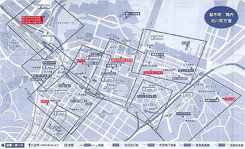 JR京浜東北線(根岸線)で3駅、左から桜木町・関内・石川町、横幅3kmぐらいの範囲です